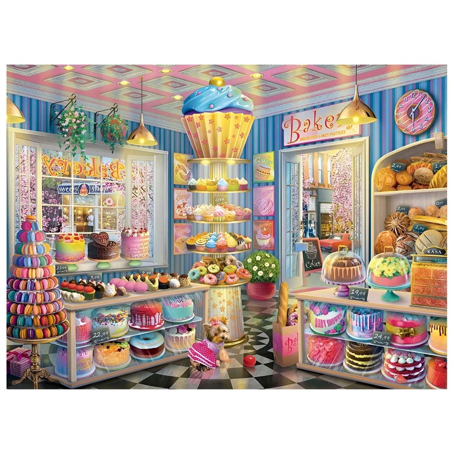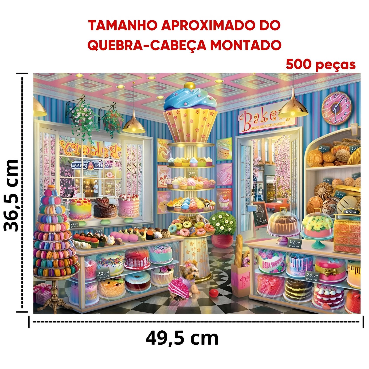 O Quebra-cabeça Doceria Colorida acompanha 500 peças. Neste saboroso quebra-cabeças, bolos, muffins, donuts e outros quitutes se entrelaçam em um espetáculo de cores, envolvendo-nos em uma aura mágica de doçura e encanto!