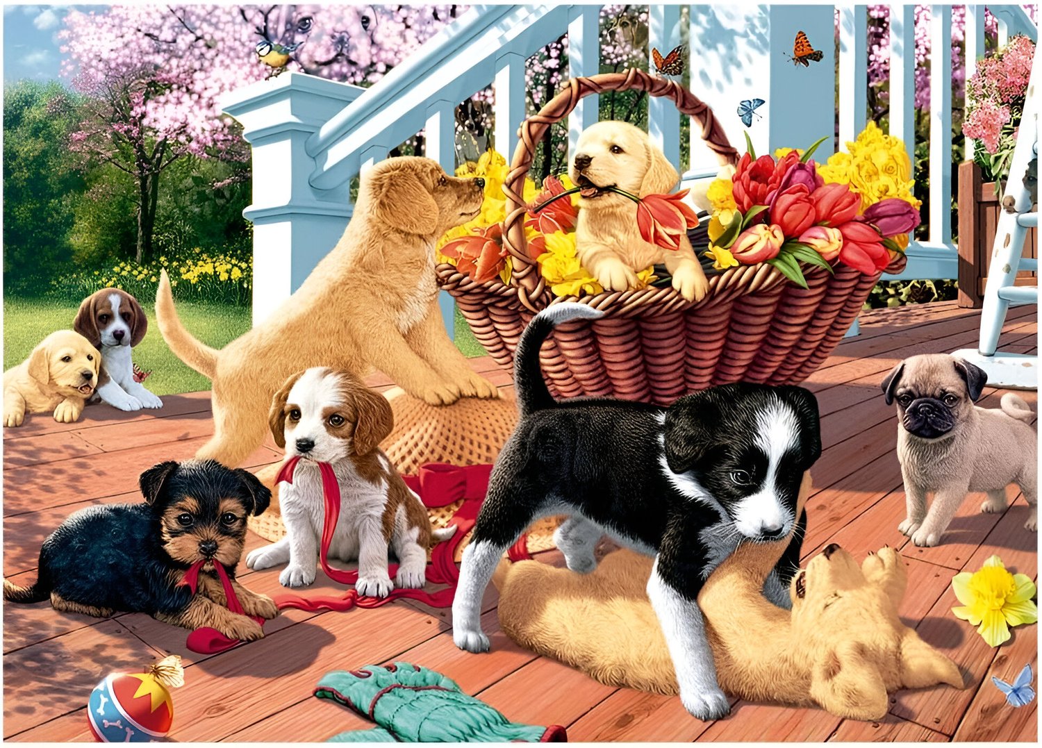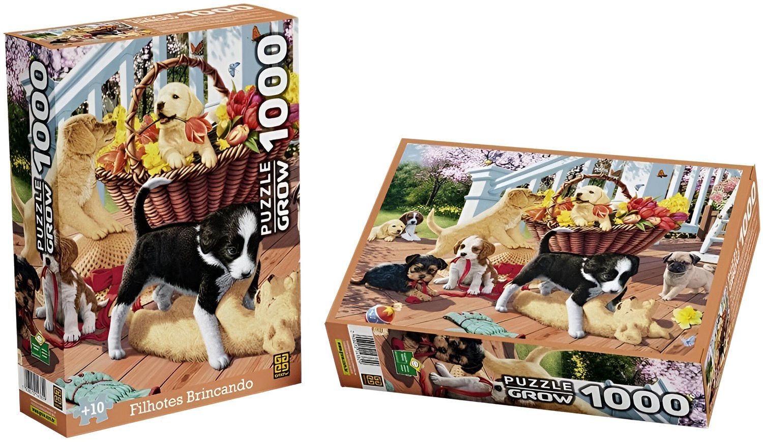 Todos os dias os moradores do quarteirão são presenteados pela alegria e fofura de alguns cachorrinhos que amam passear pela vizinhança. Os labradores que vemos na ilustração vivem nesta casa e adoram uma bagunça. Por isso são sempre bem receptivos com os filhotes de outras raças. O objetivo é muito simples: brincar e bagunçar pra valer na varanda, ao mesmo tempo em que tomam um delicioso sol de primavera. Entre você também nesta divertida reunião e monte cada uma das peças dos Filhotes Brincando!