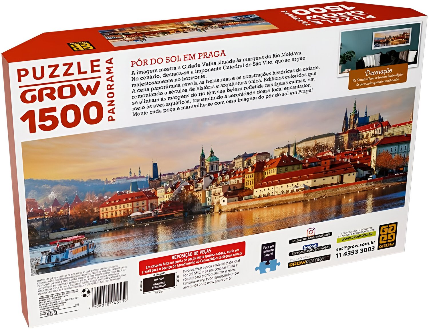 Quebra Cabeça Panorama Pôr do Sol em Praga com 1500 Peças da Grow. A imagem mostra a Cidade Velha situada ás margens do Rio Moldava. No cenário, Destaca-se a imponente Catedral de São Vito, que se ergue majestosamente no horizonte. A cena panorâmica revela as belas ruas e as construções históricas da cidade, remontando a séculos de história e arquitetura única. Edifícios coloridos que se alinham ás margens do rio têm sua beleza refletida nas águas calmas, em meio ás aves aquáticas, transmitindo a serenidade desse local encantador.