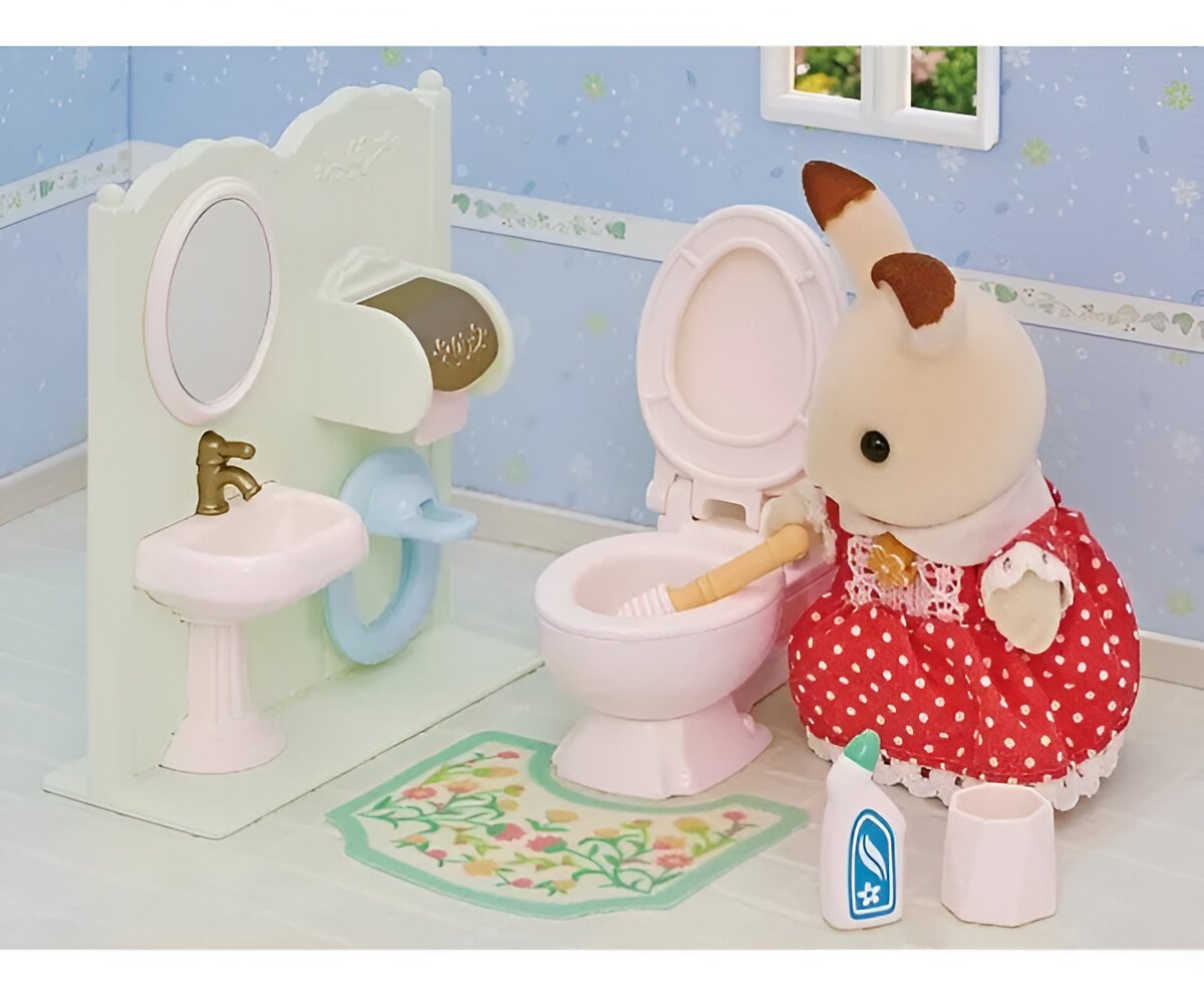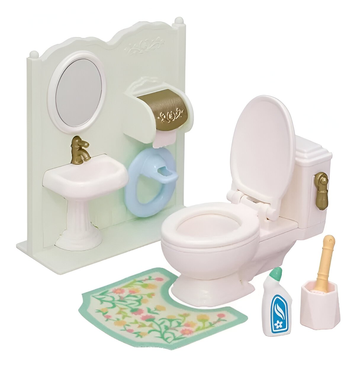 O conjunto vem com vaso sanitário, pia com espelho, penico, produtos de limpeza e até um tapetinho para deixar a brincadeira ainda mais realista! A descarga do vaso pode ser acionada pela alavanca, o papel higiênico desenrola de verdade, e o penico pode ser acoplado ao vaso, ensinando os bebês Sylvanians a usá-lo.