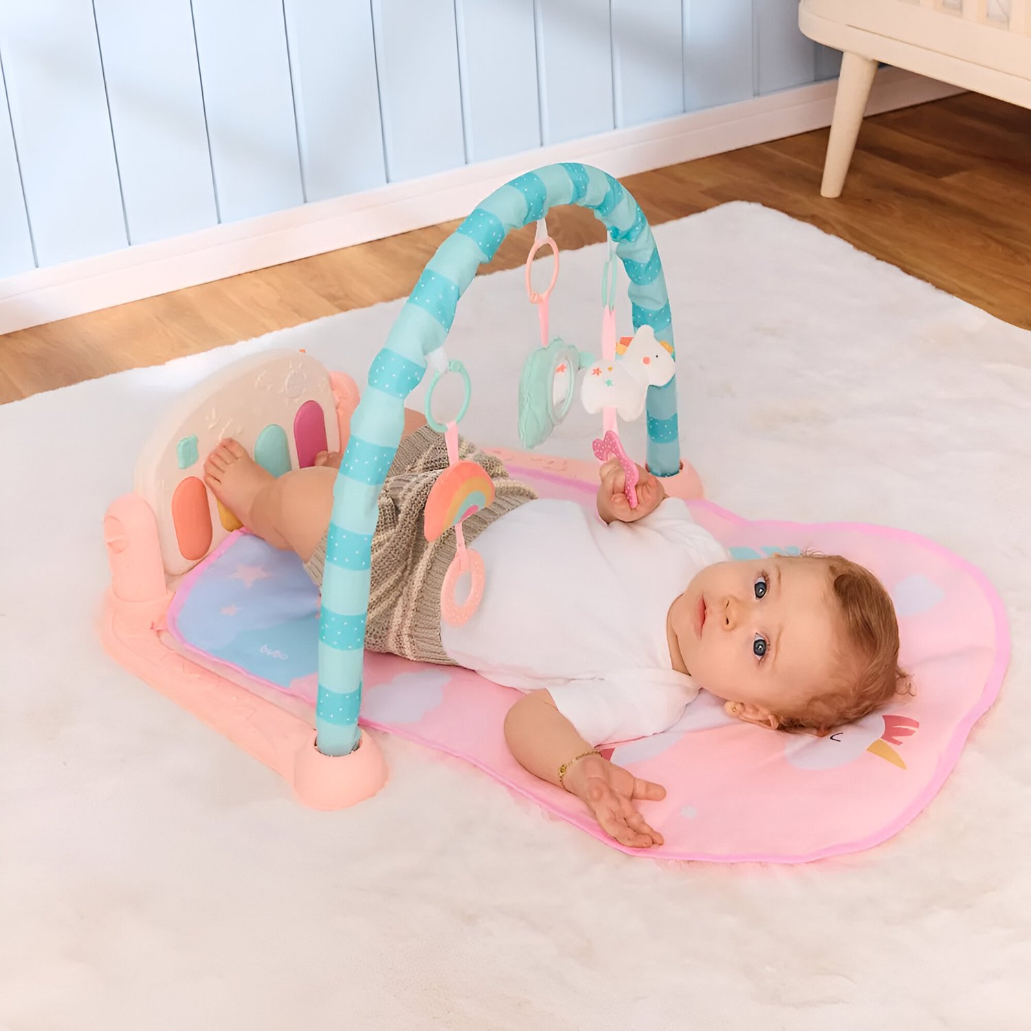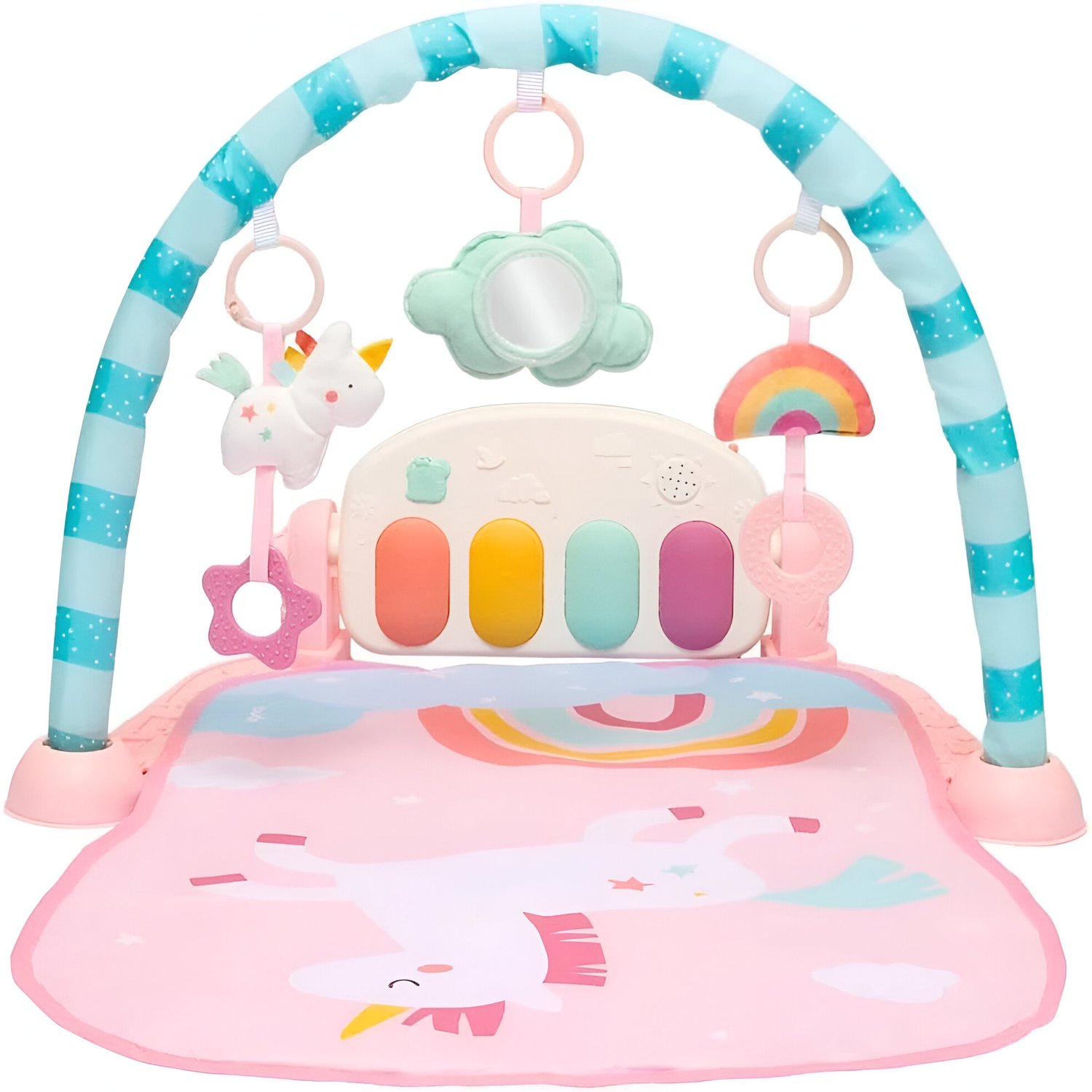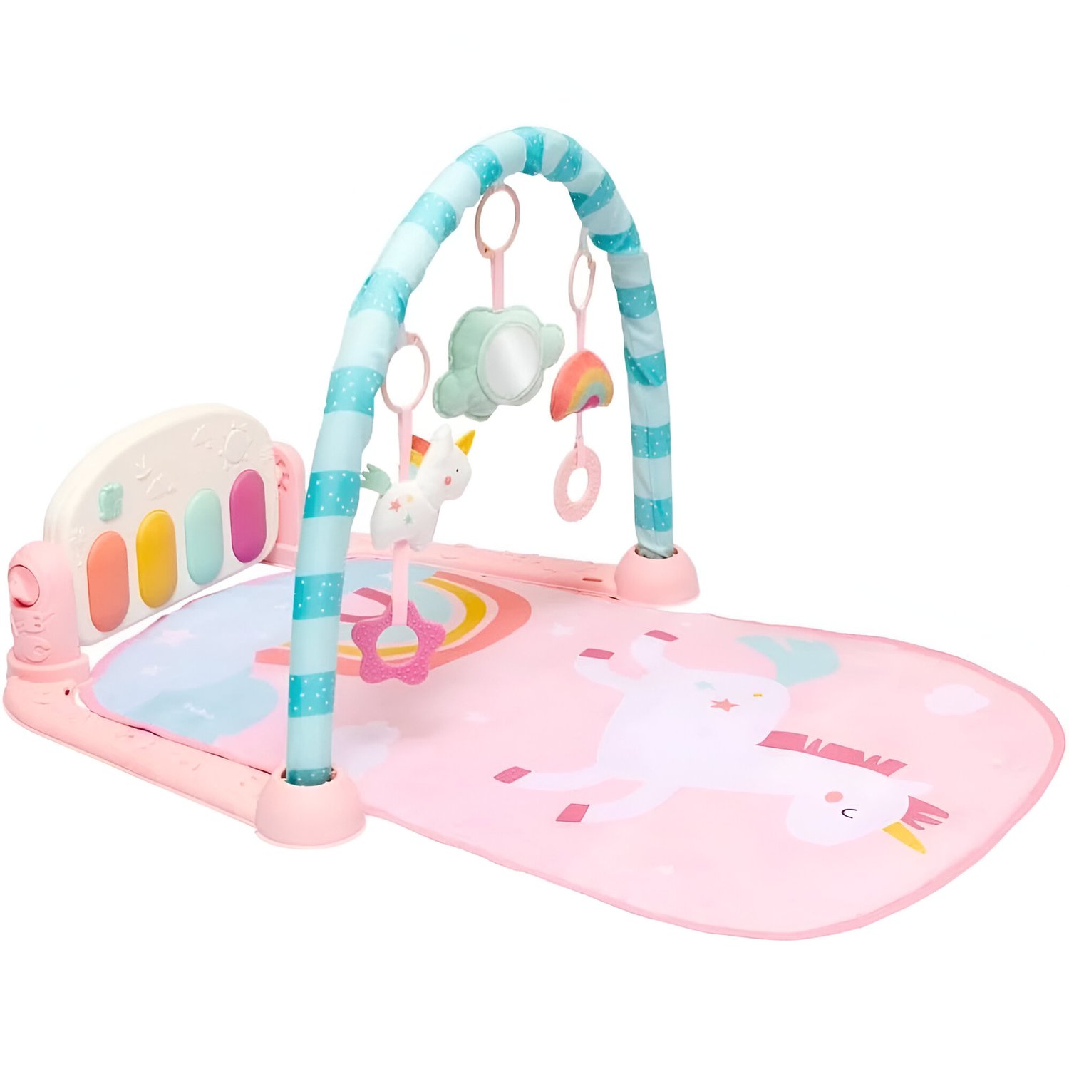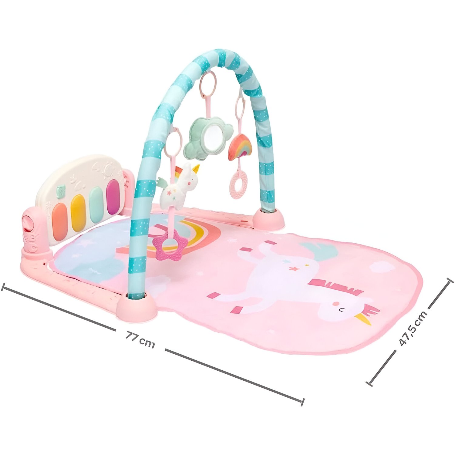 O Tapete de Atividades Unicórnio é ideal para entreter e estimular o desenvolvimento do bebê. Com piano ativado pelos pezinhos, brinquedos pendurados e espelho, promove a coordenação motora e sensorial desde os primeiros meses. Possui 4 modos de som com luzes, e tanto o piano quanto os brinquedos são removíveis para diferentes formas de brincar.