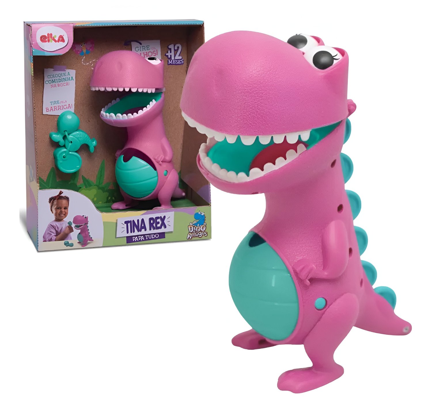 Conheça a divertida Tina Rex Papa Tudo da Elka, a dinossaurinha que adora comer! Ideal para crianças a partir de 12 meses, essa amiguinha colorida vai encantar os pequenos com sua boquinha que se abre para “comer” comidinhas como franguinho, peixe e carne. Depois, é só abrir a barriguinha dela e começar tudo de novo! Uma brincadeira educativa que estimula a imaginação e o desenvolvimento motor.