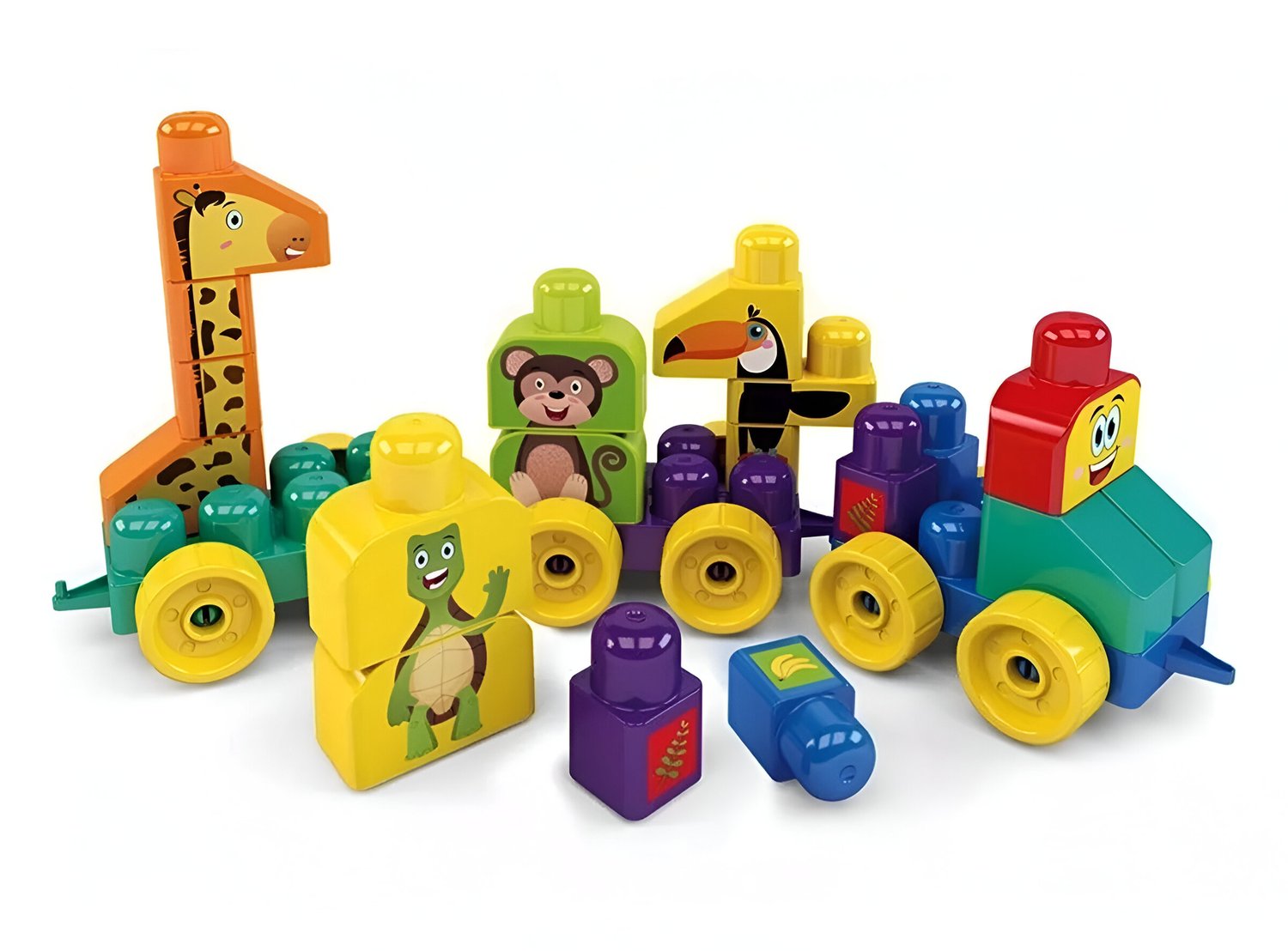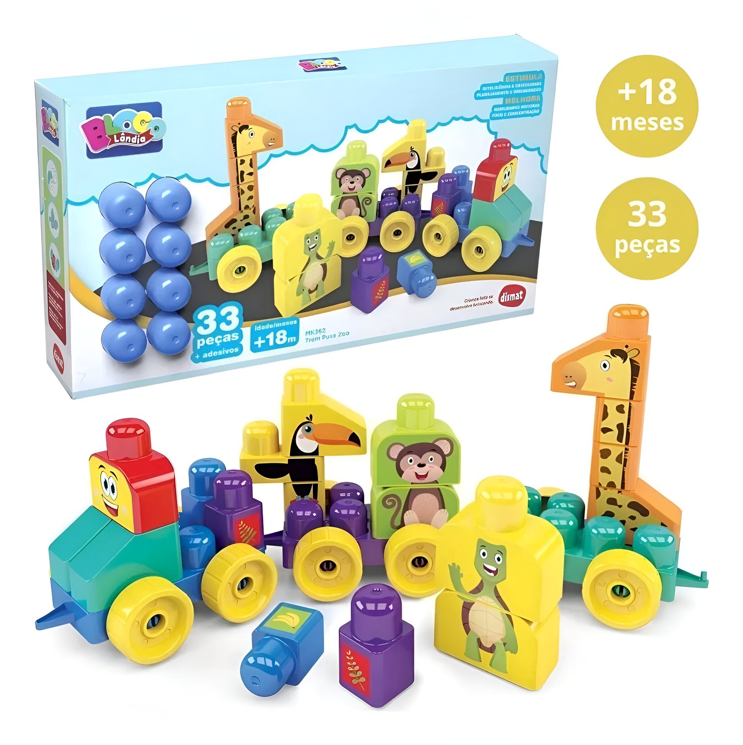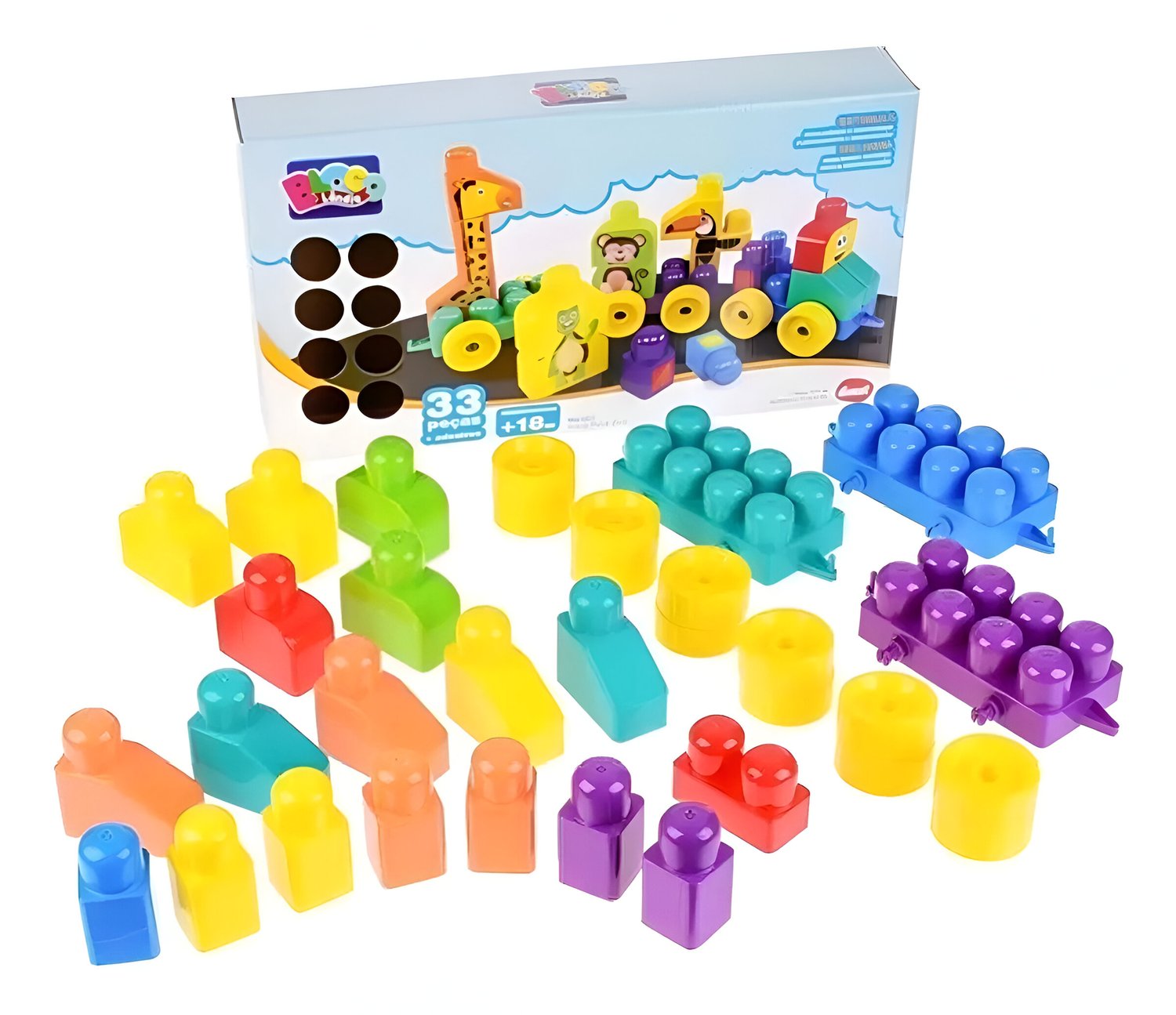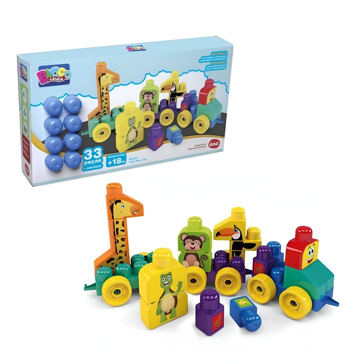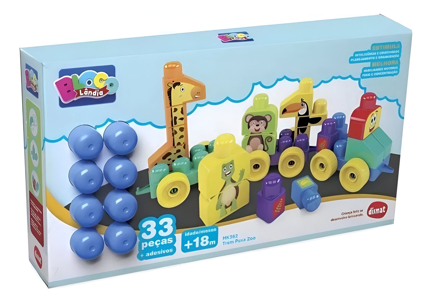O Trem Puxa Zoo da Dismat é perfeito para estimular a inteligência e criatividade das crianças! Com 33 peças de montar, os blocos se completam formando divertidos animais, enquanto os vagões de trem se encaixam entre si, permitindo uma brincadeira dinâmica e educativa. Um excelente brinquedo para o desenvolvimento cognitivo e motor.