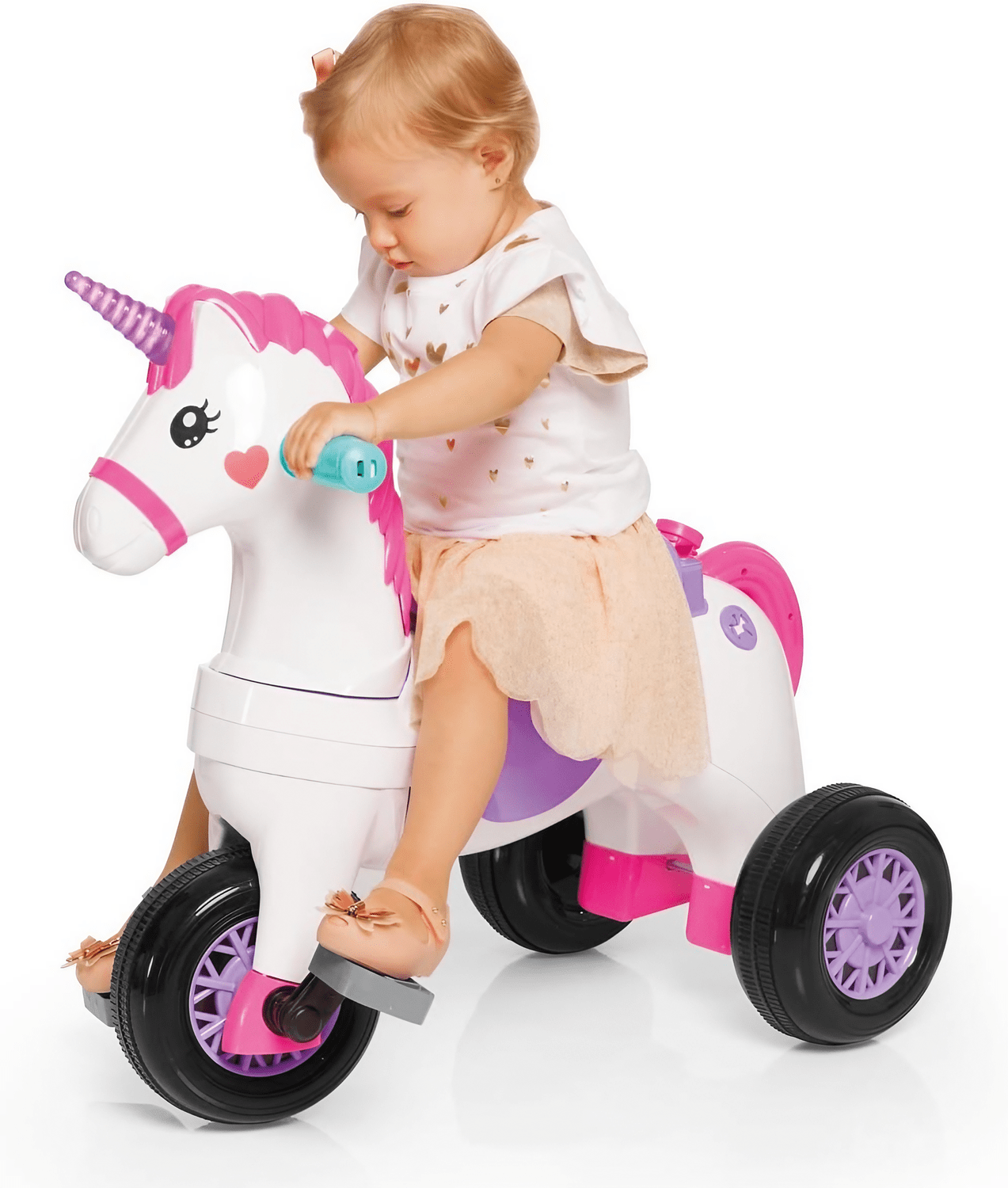 Transforme os passeios em aventuras encantadas com o Carrinho de Passeio Calesita Fantasy com Pedal! Este mágico carrinho, com design de unicórnio colorido, é perfeito para transportar as crianças ao mundo dos sonhos. Com rodas suaves e um chifre que brilha e emite sons delicados, o Calesita Fantasy torna cada passeio uma experiência mágica e divertida. Equipado com pedal e som, o carrinho não só diverte como também estimula a coordenação motora das crianças, desenvolvendo habilidades de braços e pernas. Além disso, sua direção é guiada com facilidade e segurança pelos adultos, tornando as manobras simples e seguras.