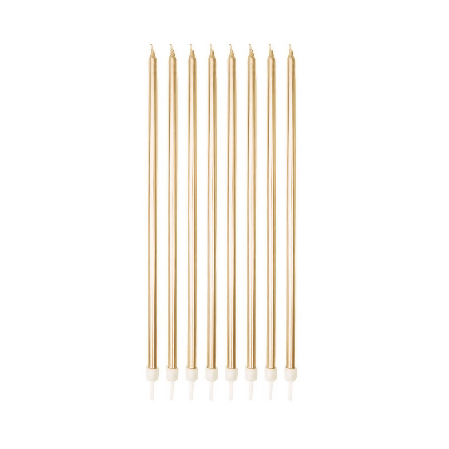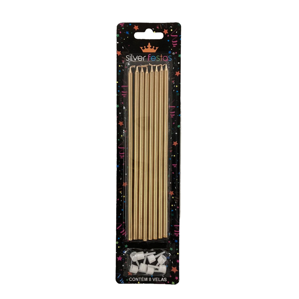 - 1 Pacote com 8 unidades da Vela Metalizada Dourada.