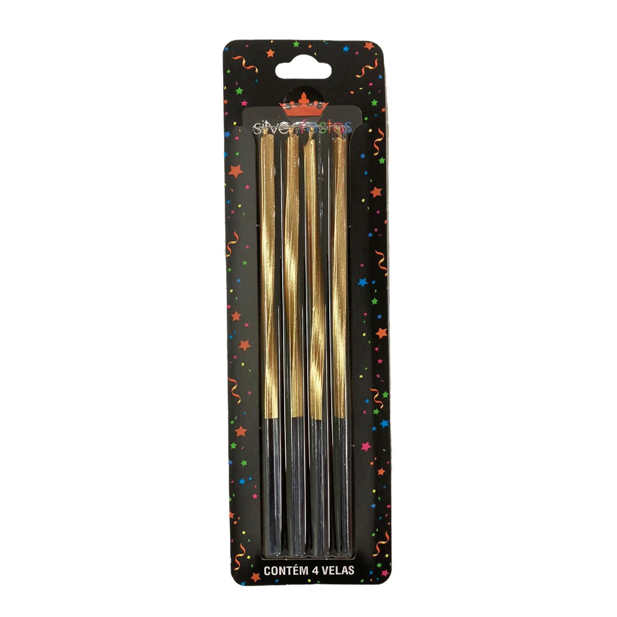 - 1 Pacote com 4 unidades de Vela Torcida Metalizada Preta e Dourado.
